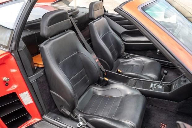 The 348 was the final V8-powered Ferrari model developed under the direction of Enzo Ferrari, and its design was overseen by Pininfarina chief stylist Leonardo Fioravanti. This example is finished in Rosso Corsa with black lower-body panels and features a removable black roof panel, pop-up headlights, fog lights, side air intakes, louvered taillights, and quad exhaust tips. The windshield was replaced, the front bumper cover was repaired, and the side skirts and front bumper were repainted in October 2013. Paint meter readings are displayed in the gallery below.